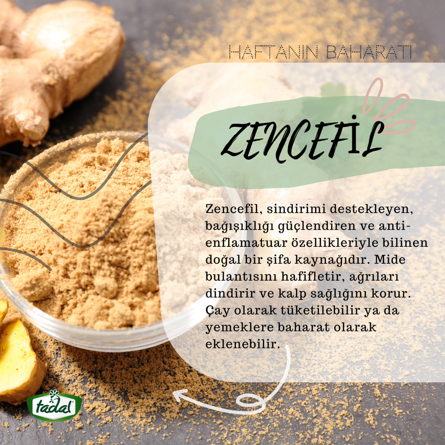 Zencefil (ginger), taze kökleriyle yemeklere hem aroma hem de şifa katan tropikal bir kök bitkisidir. Hafif baharatlı, limonsu-tatlı bir lezzeti vardır ve hem tatlı hem de tuzlu tariflerde kullanılabilir.